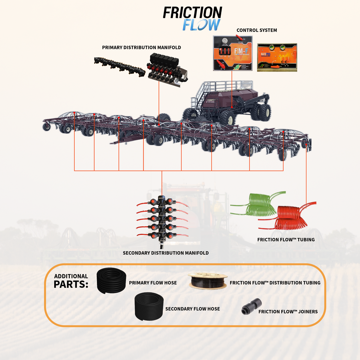Friction Flow™ Back End Systems: a modular and customizable distribution solution designed for seeder bars, planters, and toolbars. Tailored to meet your specific requirements, our back-end systems offer accurate and trouble-free liquid application.