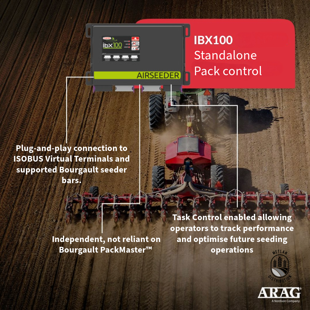 The IBX100 is a retrofittable ISOBUS pack control unit offering seamless plug-and-play compatibility with Virtual Terminals and supported Bourgault seeder bars.
